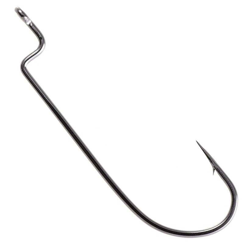 Offset worm hooks, with a worm-holding 90-degree bend shoulder. Preferred by many anglers for straight and easy rigging of plastic worms. Features include Cutting Point and black chrome finish.