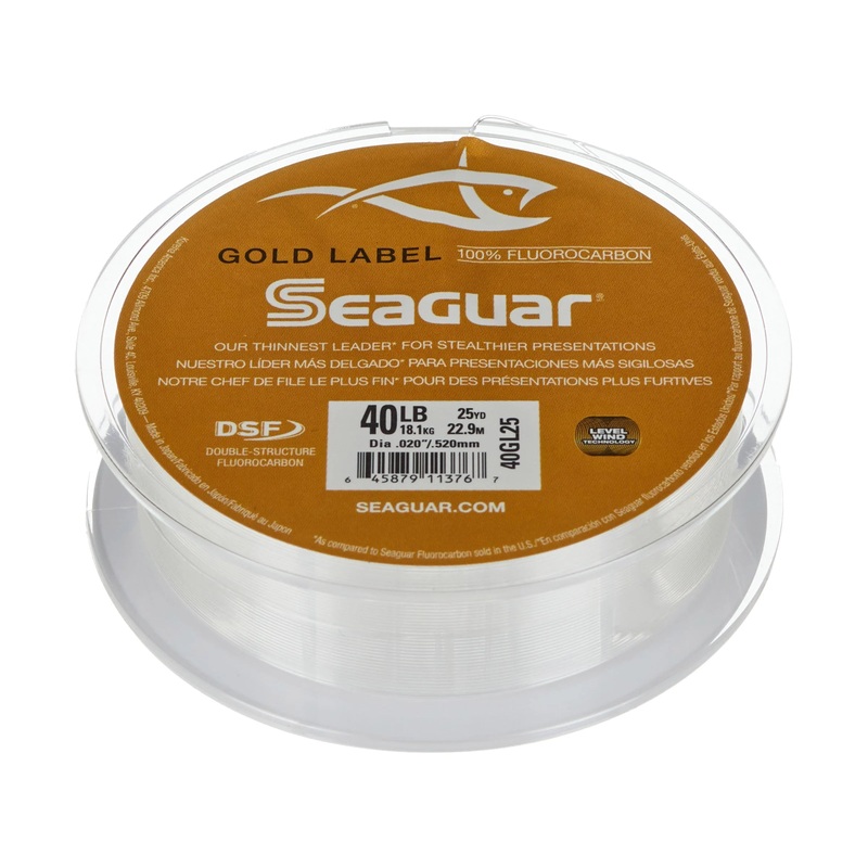 Setting the new standard in terms of quality and performance when it comes to leader material, Seaguar Gold Label Fluorocarbon Leader Line is Seaguars thinnest leader material that provides exceptional knot and tensile strength. Made using Seaguars exclusive double-structure process with two custom fluorocarbon resins, Seaguar Gold Label Fluorocarbon Leader Line is extremely soft, which makes it cinch easily for fail-safe knots. It is also extremely abrasion resistant, making it a great choice for fishing around rocks, logs, docks, and other jagged types of cover. Whether youre fishing ultra clear water, highly pressured fish, or around rough structure, Seaguar Gold Label Fluorocarbon Leader Line delivers performance that wont let you down.